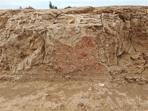 门址外双阙均为平面呈曲尺形的一母二子形式,保存较好。北阙母阙呈曲尺形,长10.76-10.86米、宽7.83-7.93米,东子阙东西长4.9米、南北宽6.86,北子阙南北长5.2、东西宽7.01米(图9)。阙台内外均有包砖沟槽,宽0.33-0.47米。北子阙连接北宫墙,宽2.59米,宫墙内侧还保存较多保存较好的带红彩墙皮(图10)。北侧近探方边发现一条东西向的排水沟穿过夯土宫墙,排水沟宽1.45米,底部尚残存铺砖。