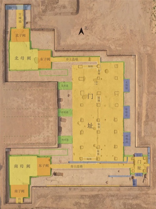 门址部分夯土台基平面呈横长方形,南北面阔约38米、东西进深19.6米,残高0.3米。台基上发现3列8排柱础破坏坑及数条夯土隔墙,推测应为面阔七间、进深两间形式的殿堂式城门,础坑间间距不等。面阔方向中门道对应处间距5.5米、南北门道间距6米,余为4.5米,南端础坑中心距台基边约0.97米,北端础坑中心距台基边约1.5米。进深方向础坑间距6.6米,东侧础坑距台基边约2.9米,西侧础坑距基槽边约3.55米。中部隔墙宽约1.13-1.25米。门址内侧环绕包边沟槽,宽约0.22-0.29米。