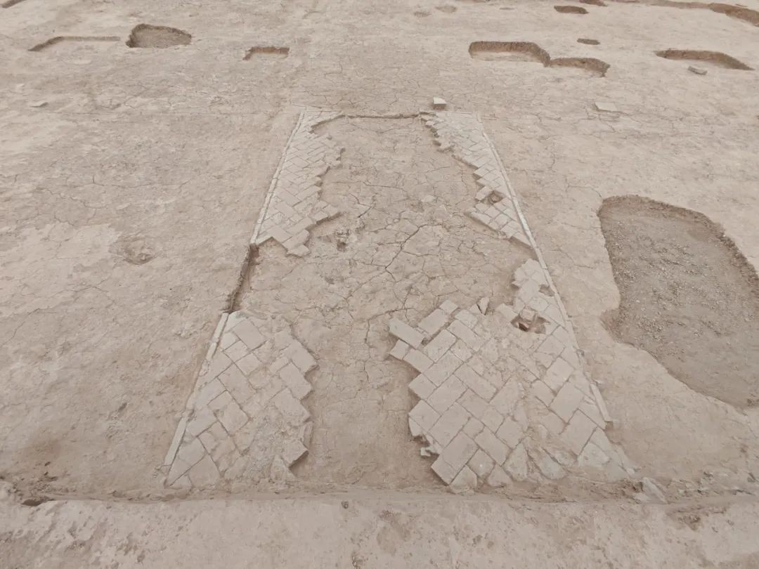 门址东侧设有三条斜坡慢道(图5),北慢道和中慢道保存较好,三条慢道均分四幅,每幅残存底部碎砖,上层铺砖仅中慢道残存小半块。中慢道自南向北每幅宽1.17、1.29、1.37、1.21米,总宽5.17、长2.23米(图6)。北慢道自北向南每幅宽1.32、1.33、1.41、1.17米,总宽5.53、长2.19米。南慢道仅存中部地袱槽及铁钉,总宽5.66、长2.21米。三条慢道之间间距4.9米,北慢道距台基北边6.21米、南慢道距台基南边侧门散水边缘约3.21米。门址西侧与慢道对应处有三条砖铺甬道,南甬道宽3.03、中甬道宽3.07(图7)、北甬道宽3.08米,南甬道距中甬道7.36米,中甬道距北甬道7.2米。甬道发掘长约5.6米。据柱网结构、门址内外对称分布的三条斜坡慢道及砖铺甬道分析,该门址中部开三门。