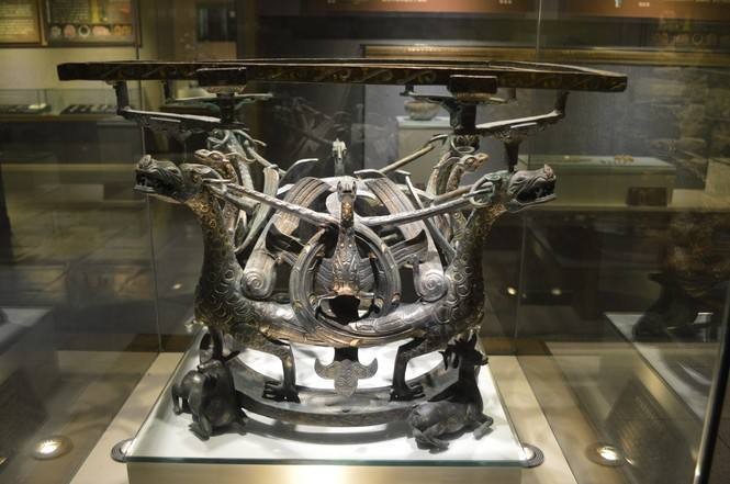 用途和功能:错金银四龙四凤铜方案作为一件青铜器,具有装饰和礼仪功能。它可能被用于宴会、祭祀或其他重要场合,展示中山国国君的权威和地位。