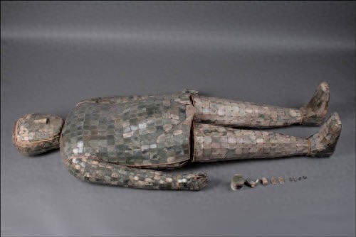 外观和特征:刘胜金缕玉衣全长1.88米,用玉片2498片,金丝1100克。玉衣按人体结构比例制作,分为头罩、上衣、袖筒、手套、裤筒和鞋等六部分。玉衣内还发现玉璧十八块,以及饭含,佩戴之物。