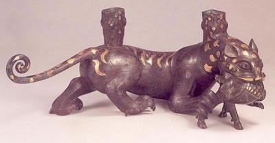 用途和功能:错金银虎噬鹿屏风座作为战国时期的家具构件,可能被用作屏风或座椅的装饰,展示主人的地位和权势。