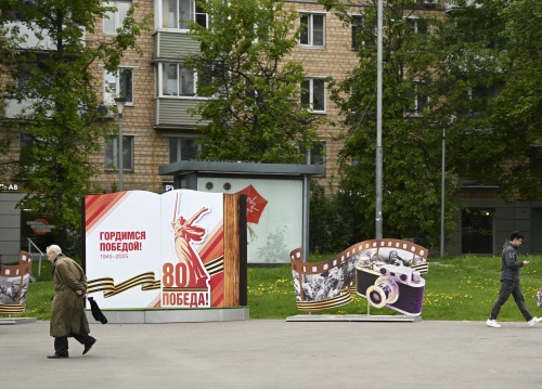 5月6日,在俄罗斯莫斯科,人们经过街头的胜利日装饰。新华社记者 张领 摄