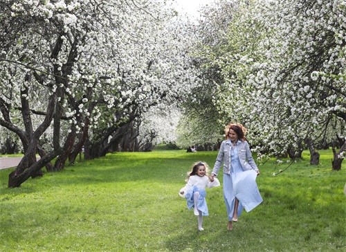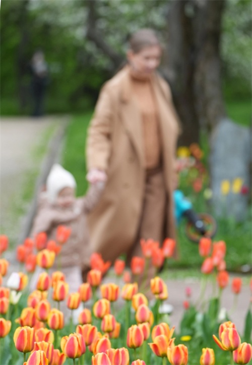 5月5日,一名女子带孩子在俄罗斯莫斯科科罗缅斯克庄园内玩耍。新华社记者 姚大伟 摄