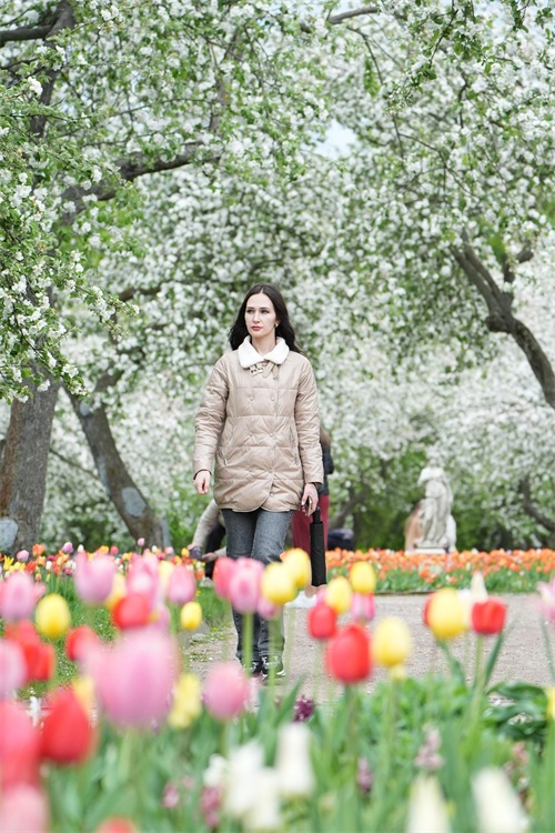 5月5日,在俄罗斯莫斯科,一名女子在科罗缅斯克庄园内休闲。新华社记者 赖向东 摄