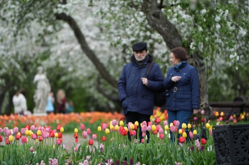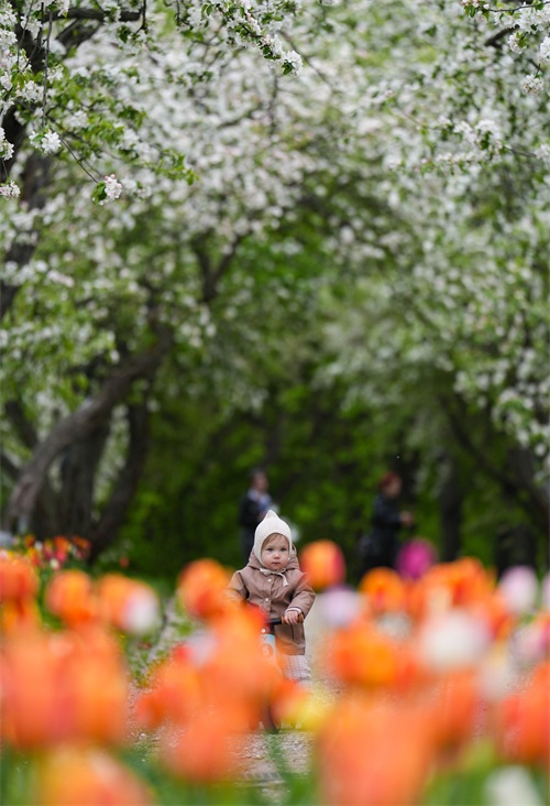 5月5日,在俄罗斯莫斯科,人们在科罗缅斯克庄园内休闲。新华社记者 赖向东 摄
