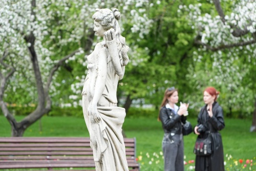 这是5月5日在俄罗斯莫斯科科罗缅斯克庄园内拍摄的一尊雕像。新华社记者 赖向东 摄