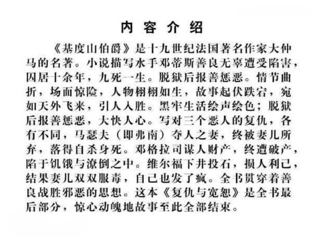 《基度山伯爵》是十九世纪法国著名作家大仲马的名著。小说描写水手邓蒂斯善良无辜遭受陷害,囚居十余年,九死一生。脱狱后报善惩恶。情节曲折,场面惊险。人物栩栩如生,故事起伏跌宕,宛如天外飞来,引人入胜。黑牢生活绘声绘色;脱狱后报善惩恶,大快人心。写对三个恶人的复仇,各有不同,马瑟夫(即弗南)夺人之妻,终被妻儿所弃,落得自杀身死。邓格拉司谋人财产,终遭破产,陷于饥饿与潦倒之中。维尔福下井投石,损人利己,结果妻儿双双服毒,自己也发了疯。全书贯穿着善良战胜邪恶的思想。这本《复仇与宽恕》是全书最后的部分,惊心动魄的故事至此全部结束。