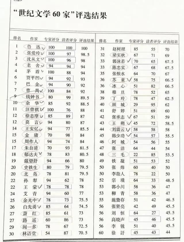 “世纪文学60家”评选结果: