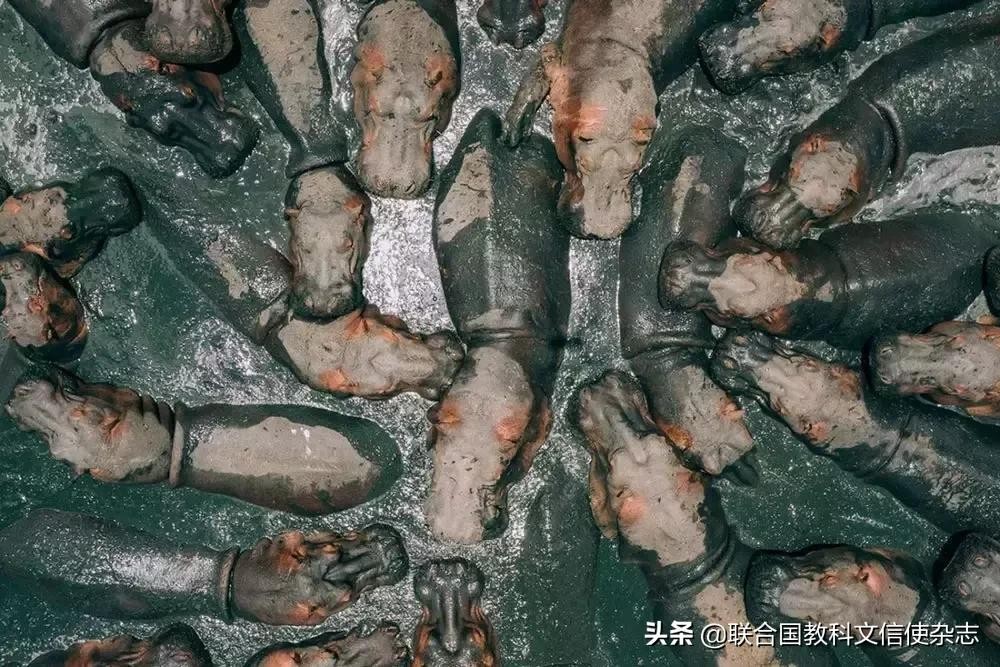 非洲坦桑尼亚,沐浴中的河马。©zekedrone