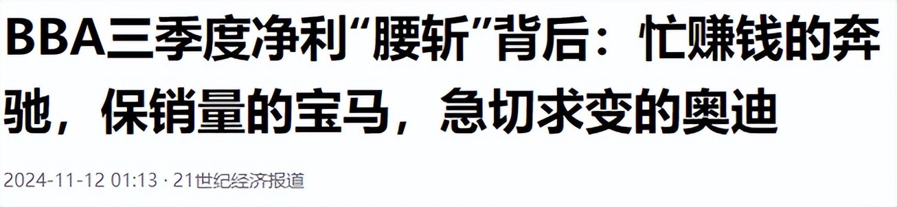 21世纪经济报道2024年11月12日---BBA三季度净利“腰斩”背后:忙赚钱的奔驰,保销量的宝马,急切求变的奥迪
