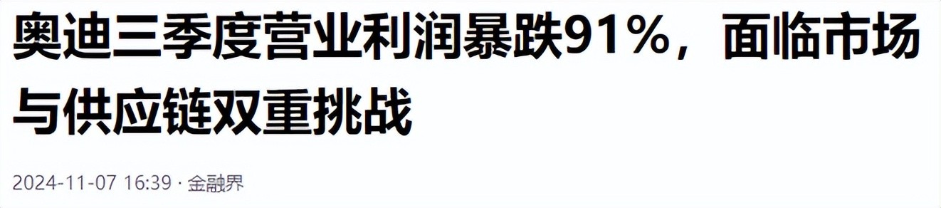 金融界2024年11月7日---奥迪三季度营业利润暴跌91%,面临市场与供应链双重挑战