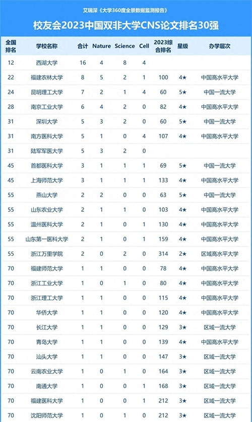 最后 , 在 至今 《艾 瑞 深 校友会2023年中国 “双非 大 学 ”CNS 论 文 排 名30 强》公布 结 果 中 ,