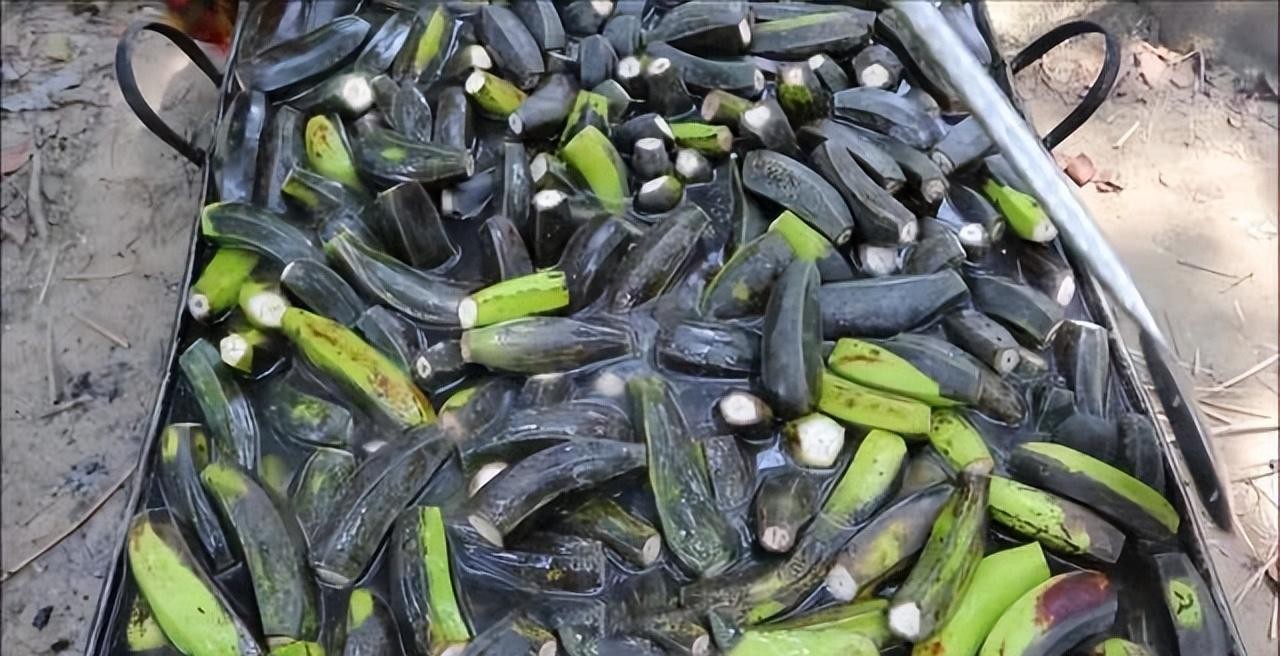 当地人会把还没有完全熟透的香蕉摘下来,放在大锅里煮,煮熟以后去皮。他们会把香蕉果肉直接扔掉或者喂牲口,把皮留下。然后在锅里面放入适量的食用盐,把香蕉皮继续放进里面煮,直至煮成黑色。