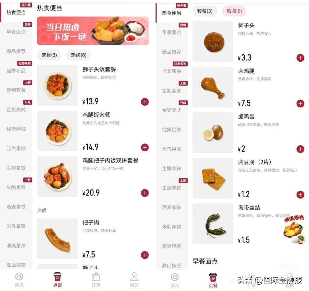今年初,有网友发现库迪北京佳境天城店开始卖早餐和午饭便当,其中,早餐包括香菇青菜包、鲜肉包、糯玉米等产品,价格在2元左右;热食包括把子肉、狮子头、卤鸡腿、卤鸡蛋、卤豆腐,价格在8元以下;快餐有鸡腿饭、狮子头饭等,价位在13.9元—20.9元。从产品SKU和定价来看,库迪将咖啡品类的低价策略延续到了热食。