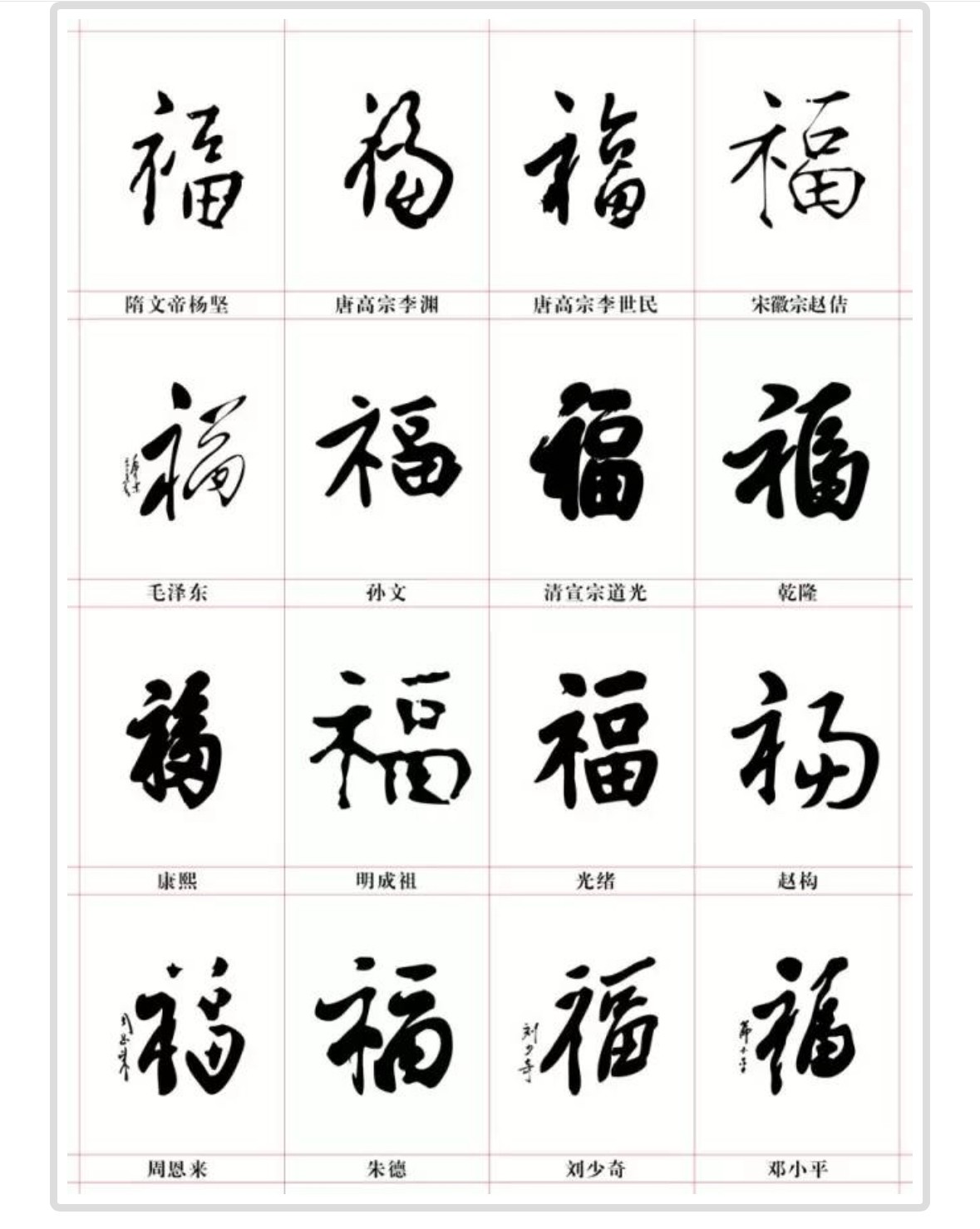 今日请欣赏:康熙、雍正、乾隆、嘉庆、道光、咸丰、同治、光绪,以及隋文帝、唐高祖、唐太宗、唐玄宗、宋徽宗、宋高宗、明成祖,这15位皇帝写的福字。一定要分享到朋友圈,看到的朋友都会福气满满!