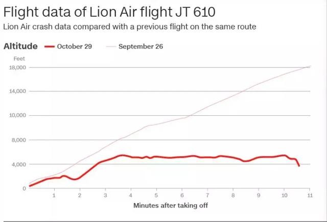 狮航JT610失事航班与此前同一航线的海拔高度对比 图据CNN