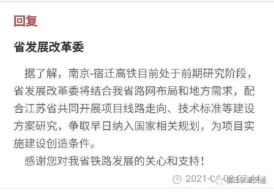 今年8月,安徽省省发展改革委回复了关于宁宿铁路建设相关信息。
