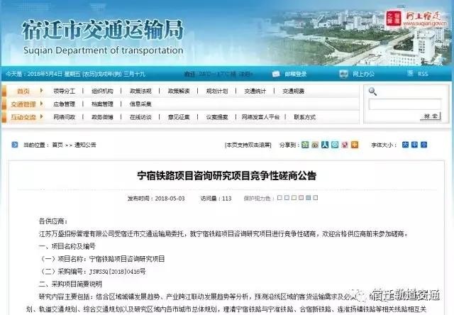 2018年5月3日,宿迁市交通运输局发布《宁宿铁路项目咨询研究项目竞争性磋商公告》,根据公告,江苏万盛招标管理有限公司受宿迁市交通运输局委托,就宁宿铁路项目咨询研究项目进行竞争性磋商。