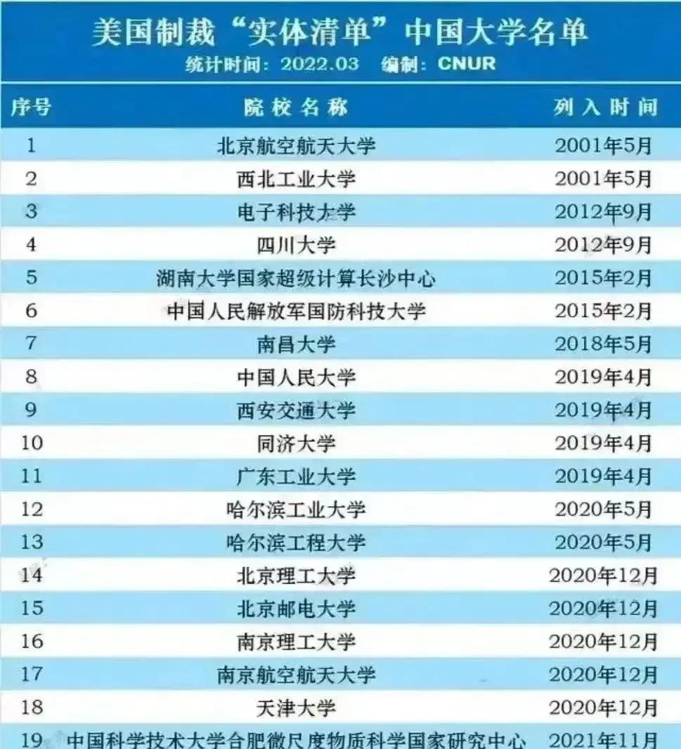 2、美国制裁的实体清单中大学名单