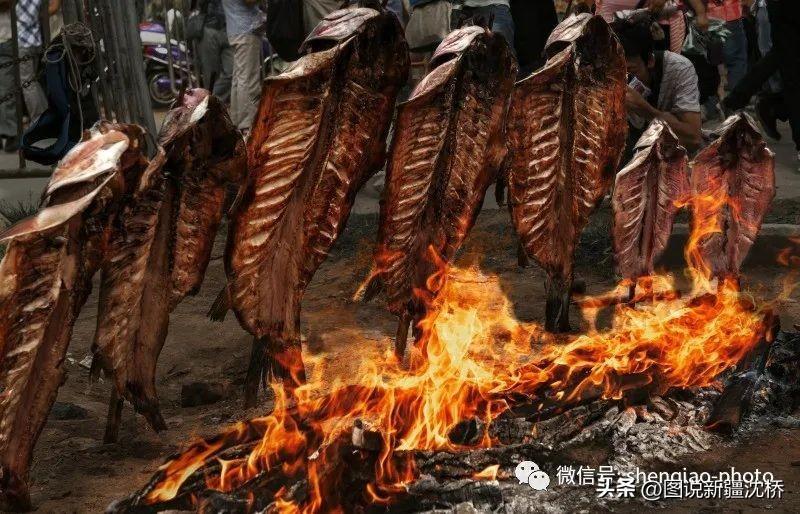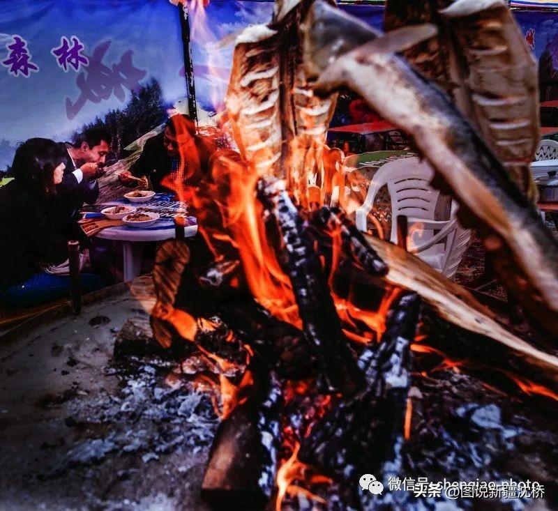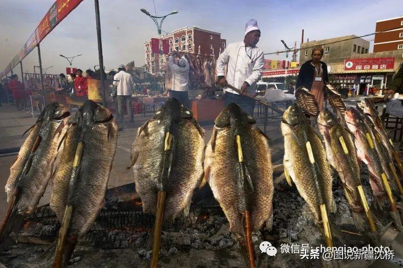 一个半圆形的铁架子上,插满了用红柳条撑开的鲤鱼和草鱼正在经受木炭的烧烤,烤鱼的主人买买提·马合苏木在忙着根据风向调整的火势。不时地往烤鱼上洒上盐水、胡椒面、孜然粉等调料。买买提•马合苏木卖烤鱼已经20多年了,年轻时跟着父亲学习烤鱼,如今带着儿子一起卖烤鱼。随着时代变迁,刀郎人的生活方式已由渔猎转为农牧方式,而红海水库因水清鱼肥,美味的烤鱼被一代代传承下来。