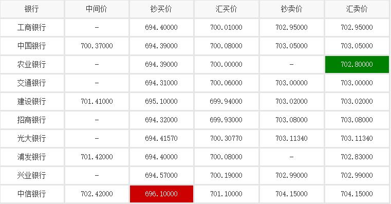 结汇(美元换人民币):去 中信银行 最划算,100 美元 最多可兑换 696.1 人民币