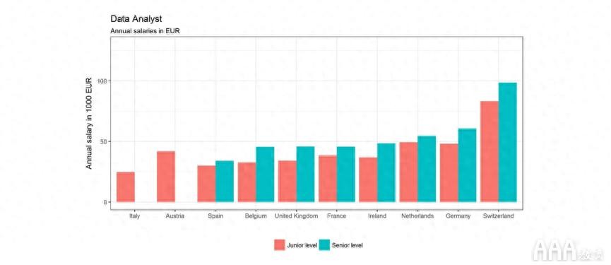 各个级别的大数据分析师职位的薪水反映了角色所需的特定技能和才能。大数据分析领域的大多数入门级职位起薪都很健康。为了举例说明大数据分析师可以根据经验获得的收入,经验不足一年的大数据分析师在德国的平均收入为40,462欧元。对于拥有五到九年经验的人,他们的角色期望收入约为50,000欧元。高级大数据分析师职位的薪资约为60,000欧元。