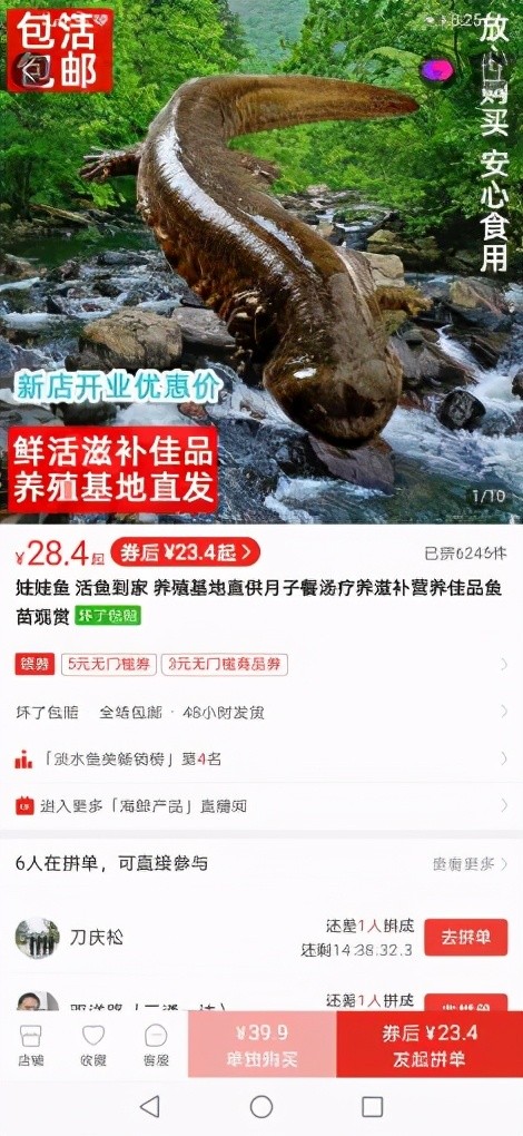 其中,一家销售榜靠前的娃娃鱼养殖基地,6斤重的娃娃鱼,11月23日拼单价为202.9元,券后售价为197.9元。