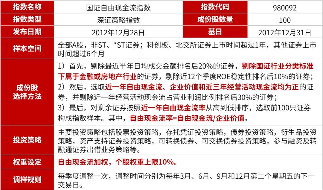 作为一个Smart Beta策略指数,国证自由现金流指数以自由现金流率为核心选股指标,强调企业基本面的稳定性和现金流质量,同时根据国内市场特色,添加以质量为主的负面剔除因子,质量因子与自由现金流因子强强联合,更加凸显指数特色和优势。