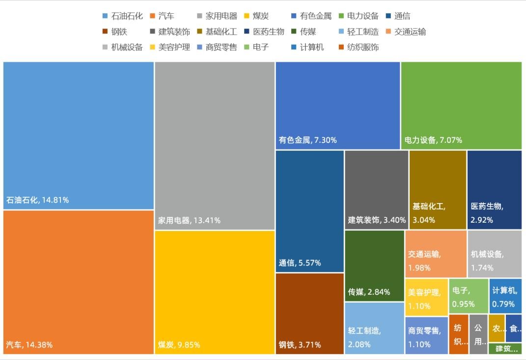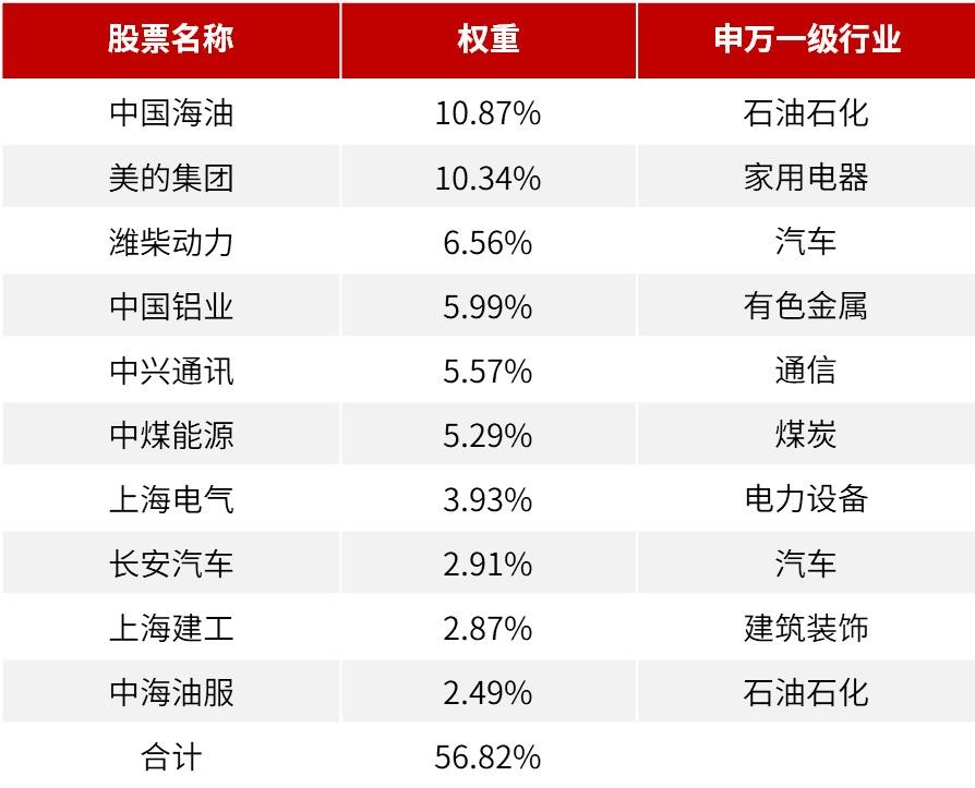 前十大个股权重相对集中,权重合计近57%,行业分散分布于石油石化、家用电器、汽车、有色金属、通信、煤炭、电力设备、汽车、建筑装饰等9个行业。