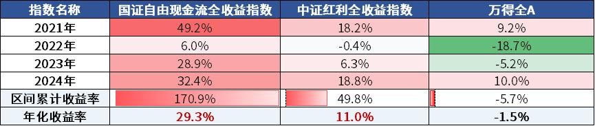 数据来源:Wind,2015.01.01至2024.12.31,国证自由现金流指数2020-2024年收益为:9.12%、43.81%、1.53%、21.87%、28.07%。年化收益率计算公式为[(1+区间收益率)^(250/交易日天数)-1]*100%。指数的过往业绩及其净值高低并不预示其未来业绩表现。