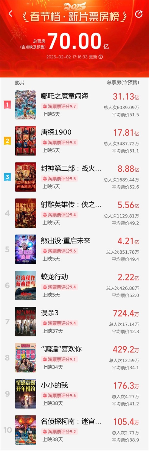 截至2月2日13时27分,影片《哪吒之魔童闹海》票房突破28.8亿,成为2025春节档现象级电影。