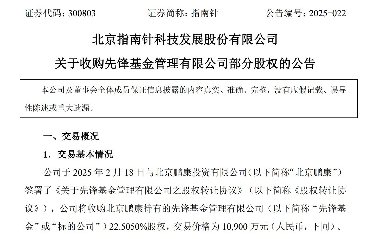 2月18日,指南针公告称,公司将收购北京鹏康持有的先锋基金22.50%股权,交易价格为1.09亿元。深圳市市场监督管理局商事主体信用监管公示平台信息显示,先锋基金上述22.50%股权已登记至指南针名下,指南针对先锋基金的持股比例升至61.70%,成为先锋基金控股股东,先锋基金将被纳入其合并报表范围。