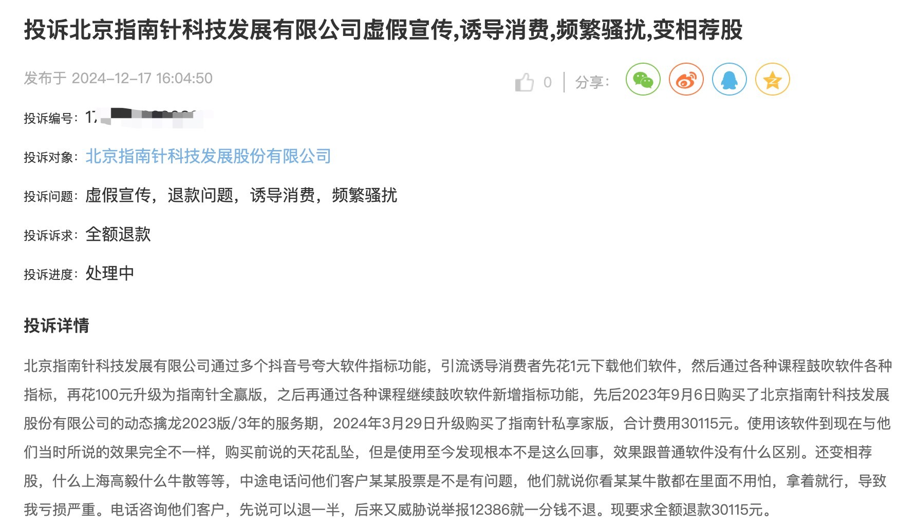 值得注意的是,指南针营销拓客时的合规度有待提升。互联网投诉平台信息显示,指南针旗下“指南针股票”app消费者投诉量上升,主要涉营销电话骚扰、虚假宣传等。