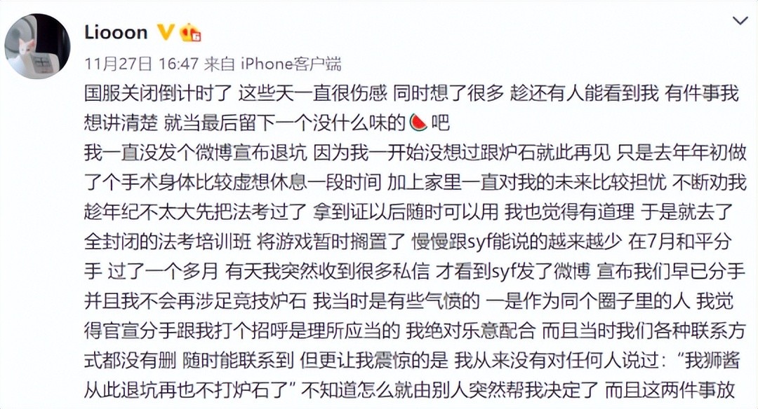 这事的起因是退坑许久的狮酱突然在11月27日下午发文称她没有退出炉石,当初是被男友随缘风坑了,被男友官宣了退坑与分手,搞得她处于十分不利的窘境。顺带着狮酱还阴阳怪气了一波,随缘风在分手之后就立马找到新欢的动作,激起了大家吃瓜的兴趣。