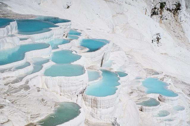 位于土耳其代尼兹利(Denizli)市的北部,是远近闻名的温泉度假胜地,此地不仅有上千年的天然温泉,更有这种古怪的好似棉花一样的山丘。土耳其文Pamuk表示棉花,Kale表示城堡,所以Pamukkale就叫棉花堡。天然钙化池,世界独一,拍照美得不可方物