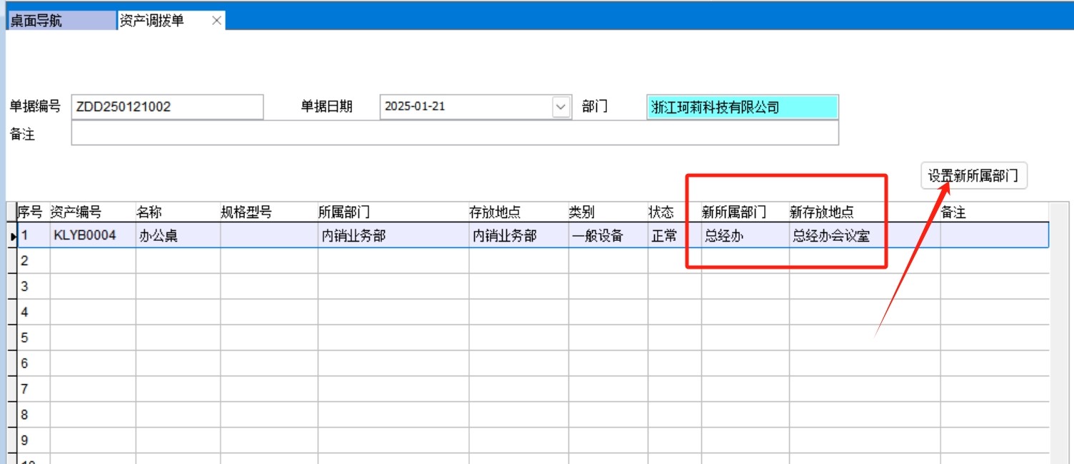 填写新的所属部门和存放位置即可。如果一次性调拨的资产较多可以点设置新所属部门一次性设置好。