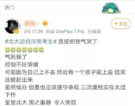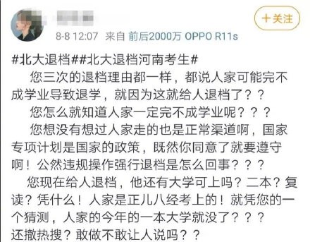 【高考成绩过低 河南考生被北大连续3次退档】“高考成绩过低,根据我校教学强度,若录取该生,考生入校后极有可能因完不成学业被退学。本着以人为本,为考生负责的态度,特向贵办申请退档。”这两天,北京大学因为这则“退档申请”,快被网友喷成了筛子。2019年,北京大学在国家专项计划中向河南省理科投放8个招生名额。排名第八的考生分数为538分,超过一本线36分,服从专业调剂,后被北大提档。但北大提档20分钟后,就以考生入学后完成不了学业会被退学为由,申请退档。河南省教育考试院并不认可这一理由,回复表示,河南整体生源质量较高,考生基础扎实,请考虑为盼。但北大继续以同样理由两次提出退档申请。三回合拉锯后,河南省教育考试院最终同意北大退档。via 科技日报