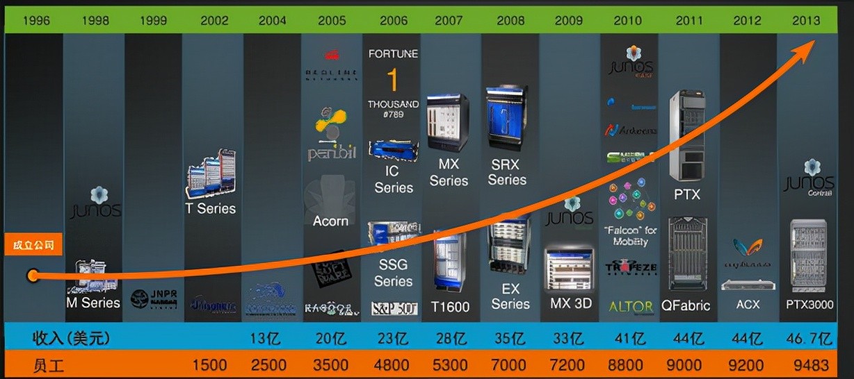 1998年第四季度:Juniper推出操作系统JUNOS,推出40G容量、ASIC设计、带OC-48接口的核心路由器M40。1998年之前运营商和ISP基本只有思科的核心路由器可以选择。