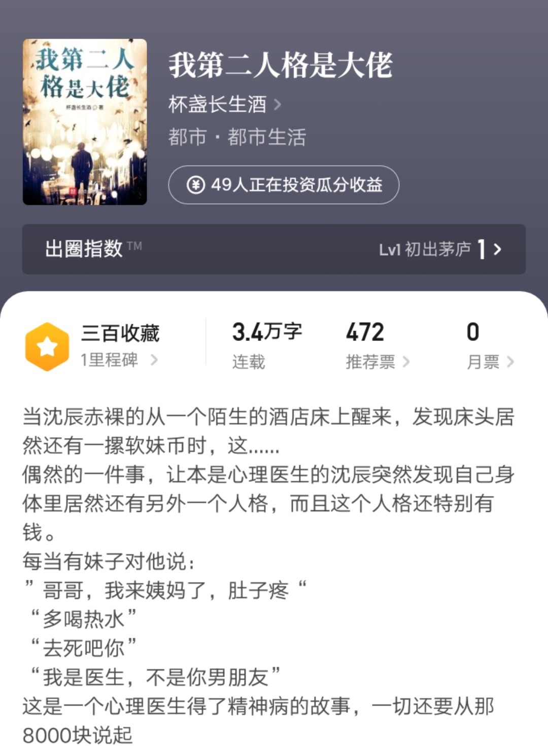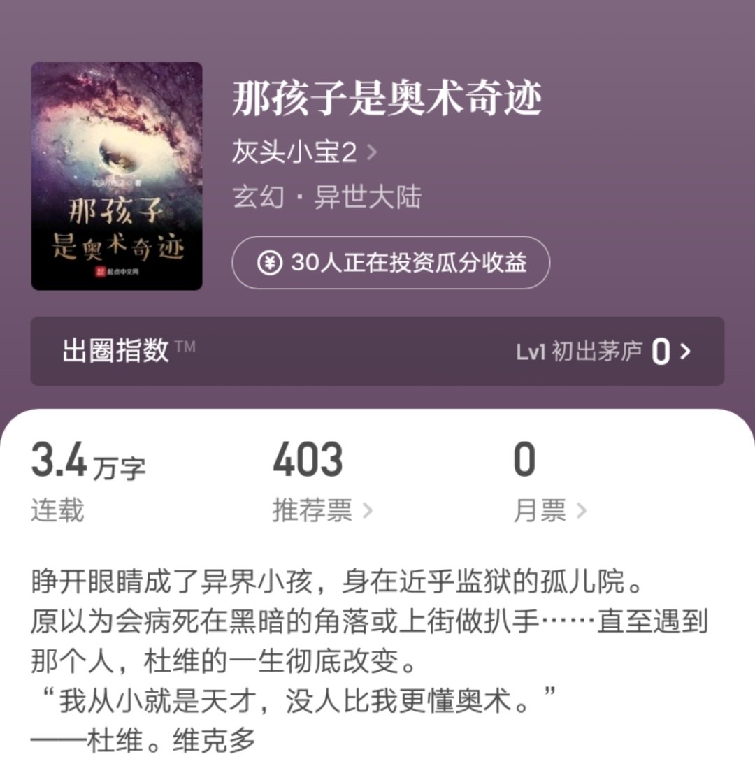 不过近来发展也是不顺,上本都市异能类的小说《入主星河》十三万字太监了。