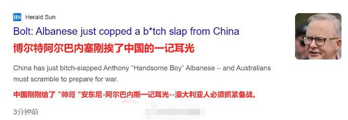 更值得津津乐道的,应该是澳大利亚国内截然不同的反应。从澳媒披露的部分澳国内保守派的反应来看,他们纷纷指责阿尔巴尼斯政府对华态度“过于软弱”,直接辱骂和对阿尔巴尼斯进行人身攻击的都不少,还有部分澳媒甚至鼓吹要“备战”。