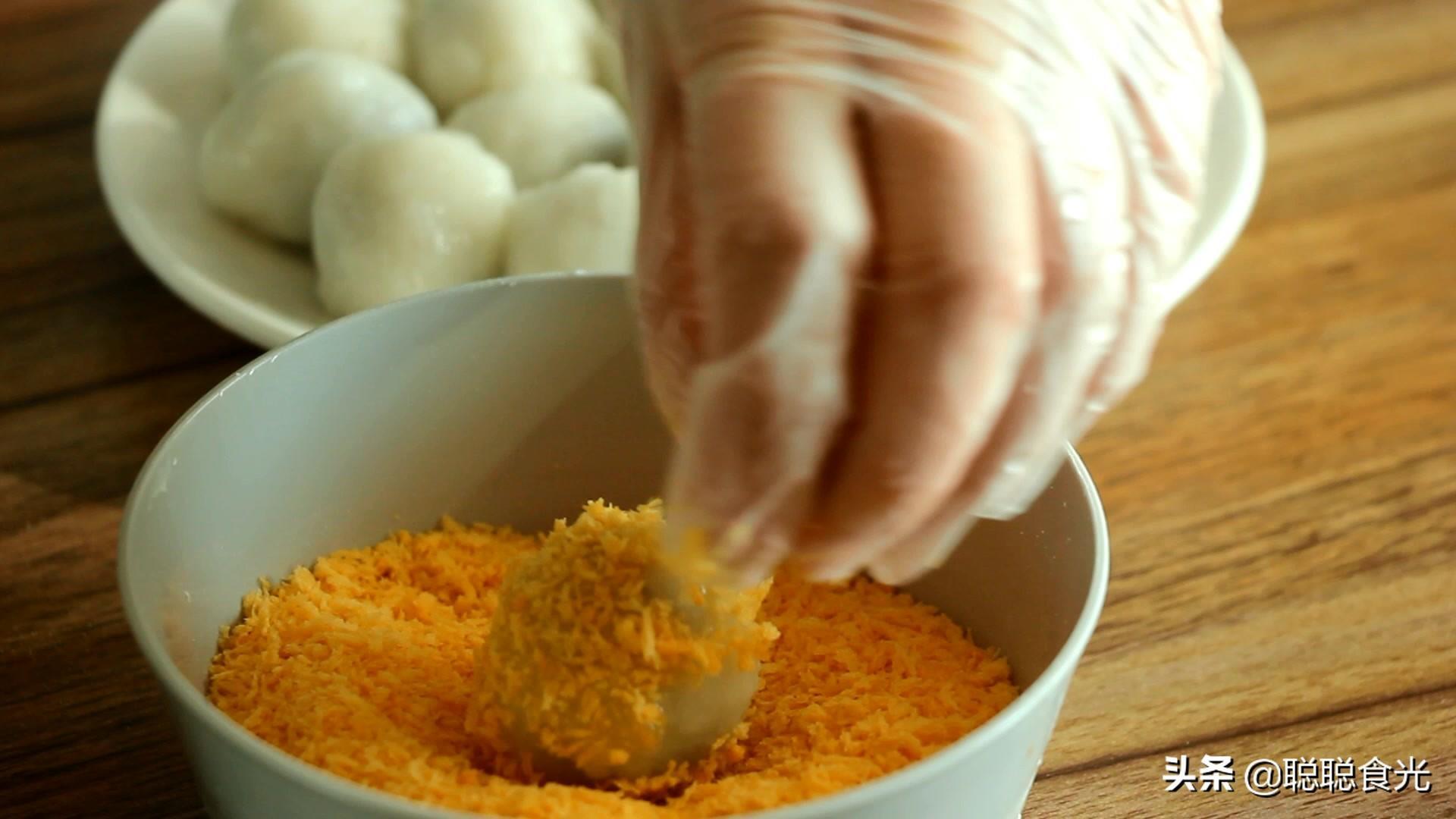 2、在元宵表面粘面包糠的目的是防止元宵黏在一起,糯米面皮在炸的时候会很粘,很容易黏在一起,所以需要裹一层面包糠。
