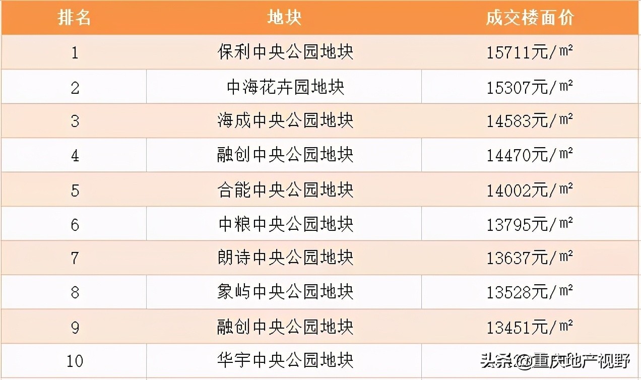 如图,我们可以看一看这一次拍地的10宗破万元地块当中,都在渝北区,都在中央公园这样的热点板块,而且最高的地王也在这里。