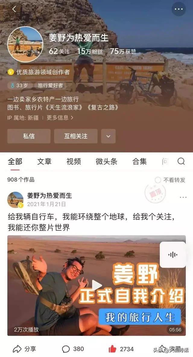35 岁的徒步网红姜野,用 6 年的时间,走遍了 30 个国家、5 万公里路,还写了 25 万字的游记,他在徒步圈特别的火,很多人因为他的游记爱上了徒步、骑行。