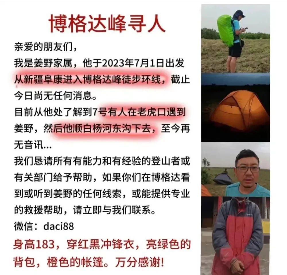 姜野家属此前发布的寻人启事显示,姜野于 7 月 1 日出发从新疆阜康进入博格达峰徒步环线后失联。