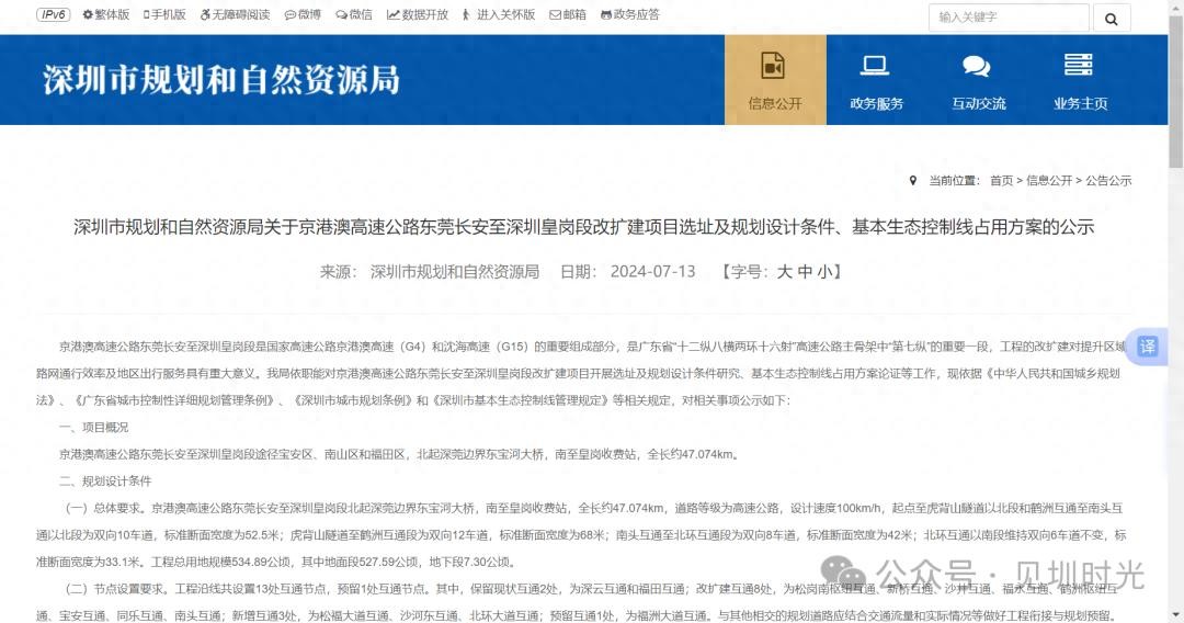 近日,深圳市规划和自然资源局关于京港澳高速公路东莞长安至深圳皇岗段改扩建项目选址及规划设计条件、基本生态控制线占用方案的公示。