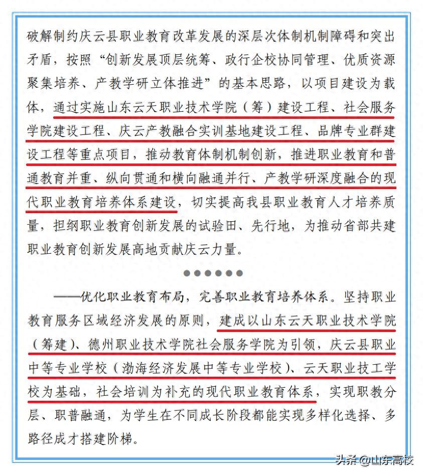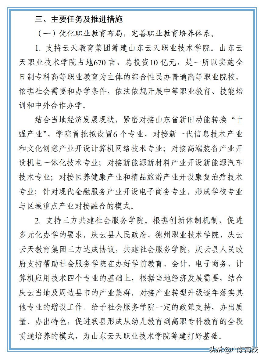 2020年7月31日,庆云县人民政府印发《庆云县建设职业教育创新发展高地实施方案》(庆政发〔2020〕7号),其中提出:建成以山东云天职业技术学院(筹建)、德州职业技术学院社会服务学院为引领,庆云县职业中等专业学校(渤海经济发展中等专业学校)、云天职业技工学校为基础,社会培训为补充的现代职业教育体系……支持三方共建社会服务学院。根据创新体制机制,促进多元化办学的要求,庆云县人民政府、德州职业技术学院、庆云云天教育集团三方达成协议,共建社会服务学院,庆云县人民政府支持帮助社会服务学院在办好学前教育、会计、电子商务、计算机应用技术四个专业的基础上,根据当地经济发展需要,结合庆云当地及周边县市的产业集群,对接产业转型升级逐年落实其他专业的增设工作。给予社会服务学院一定的政策支持,办出质量、办出特色,促进我县形成从幼儿教育到高职专科教育的全段贯通培养的模式,为山东云天职业技术学院筹建打好基础。