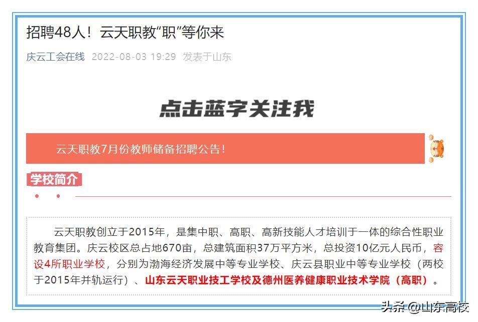 2022年8月3日,“庆云工会在线”发布招聘公告《招聘48人!云天职教“职”等你来》,其中提到:云天职教创立于2015年,是集中职、高职、高新技能人才培训于一体的综合性职业教育集团。庆云校区总占地670亩,总建筑面积37万平方米,总投资10亿元人民币,容设4所职业学校,分别为渤海经济发展中等专业学校、庆云县职业中等专业学校(两校于2015年并轨运行)、山东云天职业技工学校及德州医养健康职业技术学院(高职)。