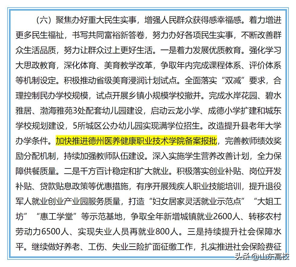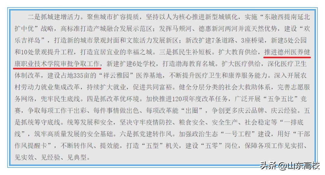 2021年11月19日,德州新闻网发布文章《庆云五年教育投入23.8亿元 改扩建学校69所》,其中提到:德州医养健康职业技术学院申报工作稳步推进。