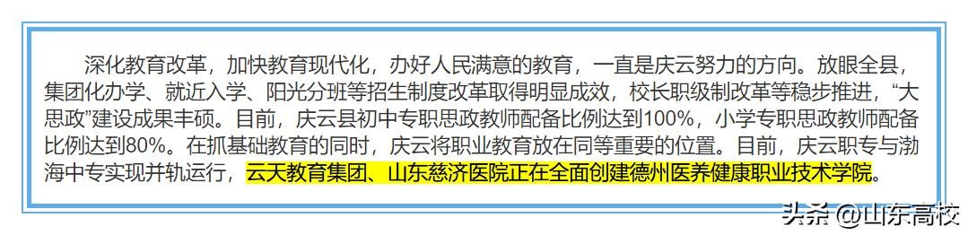 2021年10月15日,德州新闻网发布文章《庆云:撬动高质量发展的教育“支点”》,其中提到:目前,庆云职专与渤海中专实现并轨运行,云天教育集团、山东慈济医院正在全面创建德州医养健康职业技术学院。